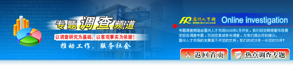 | 為了解企業(yè)人才需求狀況,以更好地為企業(yè)提供人才保障,眉山市人力資源市場特開設(shè)企業(yè)人才需求情況調(diào)查,歡迎各企業(yè)踴躍參與! |