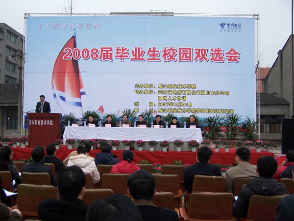 2007年12月31日上午10時,眉州人才市場與眉山職業(yè)技術(shù)學(xué)院聯(lián)合舉辦的“2008屆畢業(yè)生雙選會”隆重開幕,此次盛會是眉州人才市場與眉山職業(yè)技術(shù)學(xué)院為解決應(yīng)屆畢業(yè)生就業(yè)的重大舉措,推進(jìn)了該校畢業(yè)生就業(yè)工作,促進(jìn)畢業(yè)生充分就業(yè),為用人單位和畢業(yè)生提供一個雙向選擇的平臺,此次盛會有近150家招聘單位蒞臨招聘,2000余名求職者到會求職。